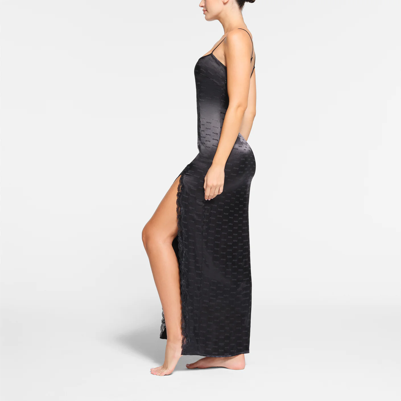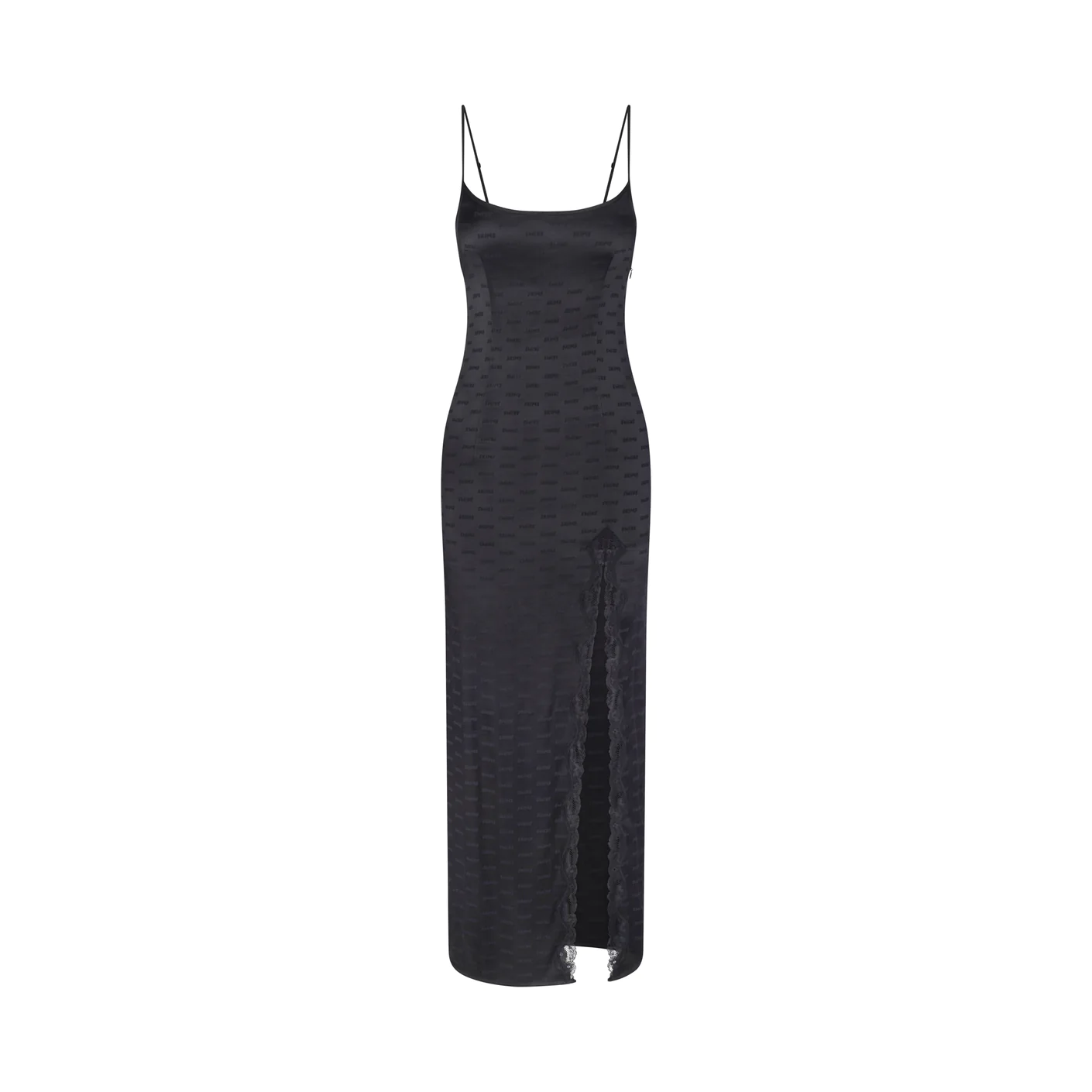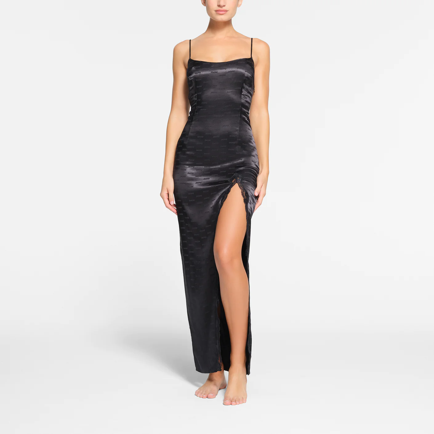 Lounge in luxury with this striking, elevated slip. Featuring lace trim along the front slit and a flattering straight neck, this full-length silhouette is set with sexy details from head to toe. Made with our shiny jacquard fabric with repeating SKIMS logo throughout. Includes adjustable straps and an invisible side seam zipper. Fits true to size.