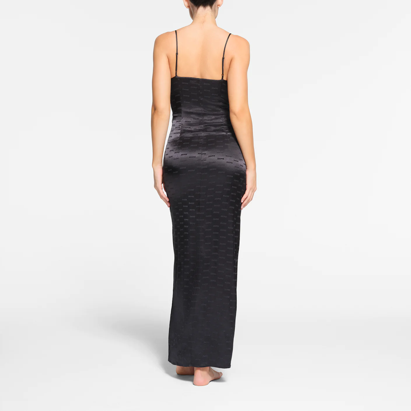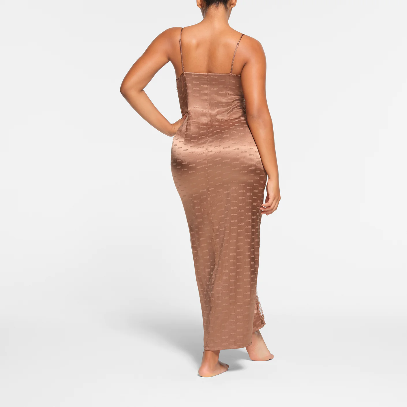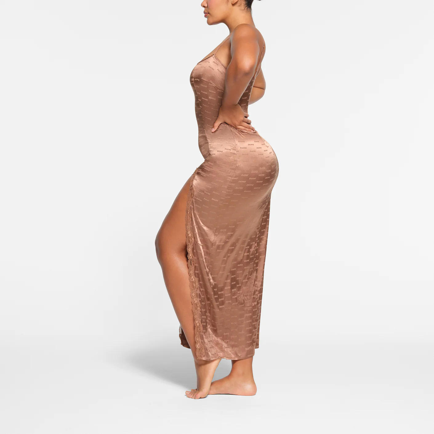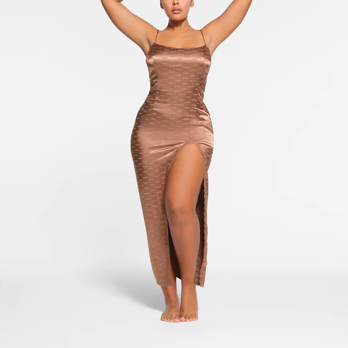 Lounge in luxury with this striking, elevated slip. Featuring lace trim along the front slit and a flattering straight neck, this full-length silhouette is set with sexy details from head to toe. Made with our shiny jacquard fabric with repeating SKIMS logo throughout. Includes adjustable straps and an invisible side seam zipper. Fits true to size.