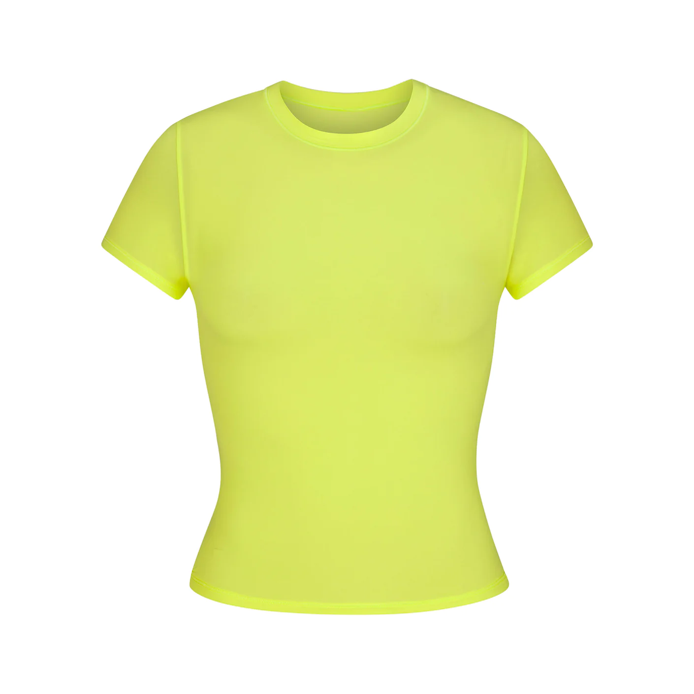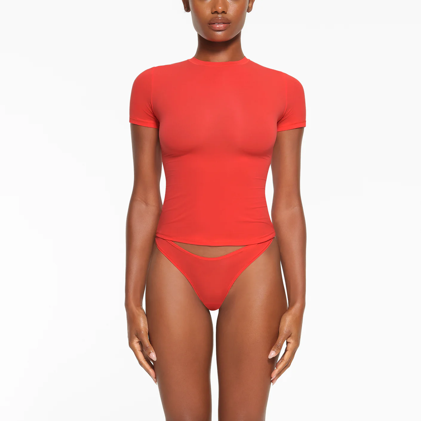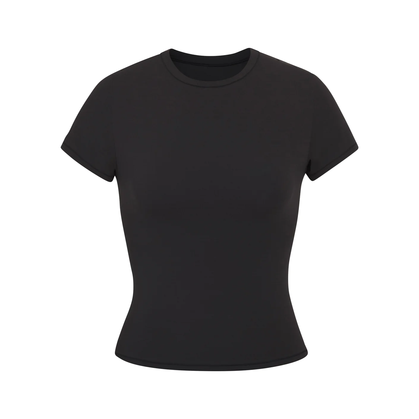 The essential everyday fitted t-shirt: with a crew neck fit and buttery soft feel, this body-hugging tee is perfect to wear alone or layered under other pieces.