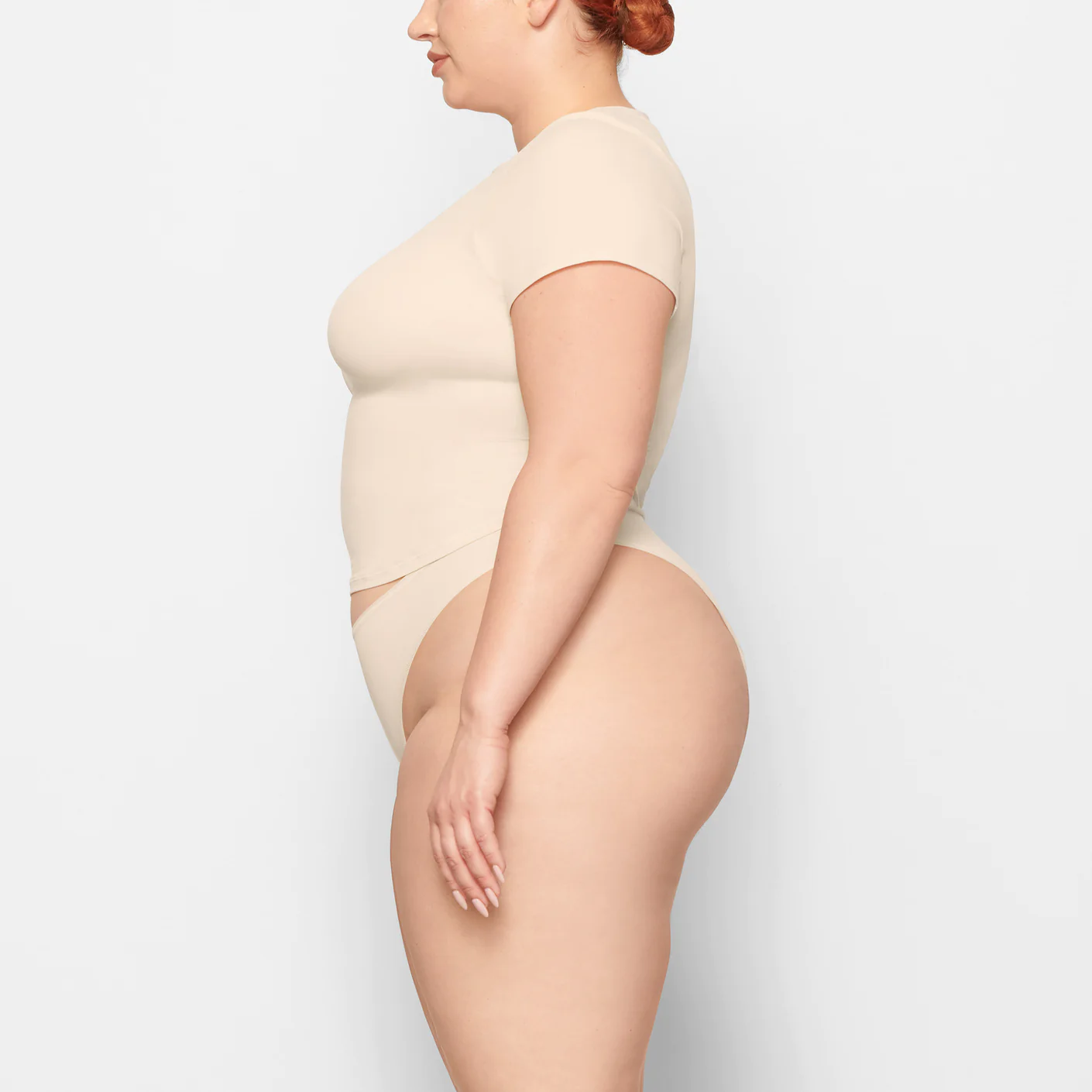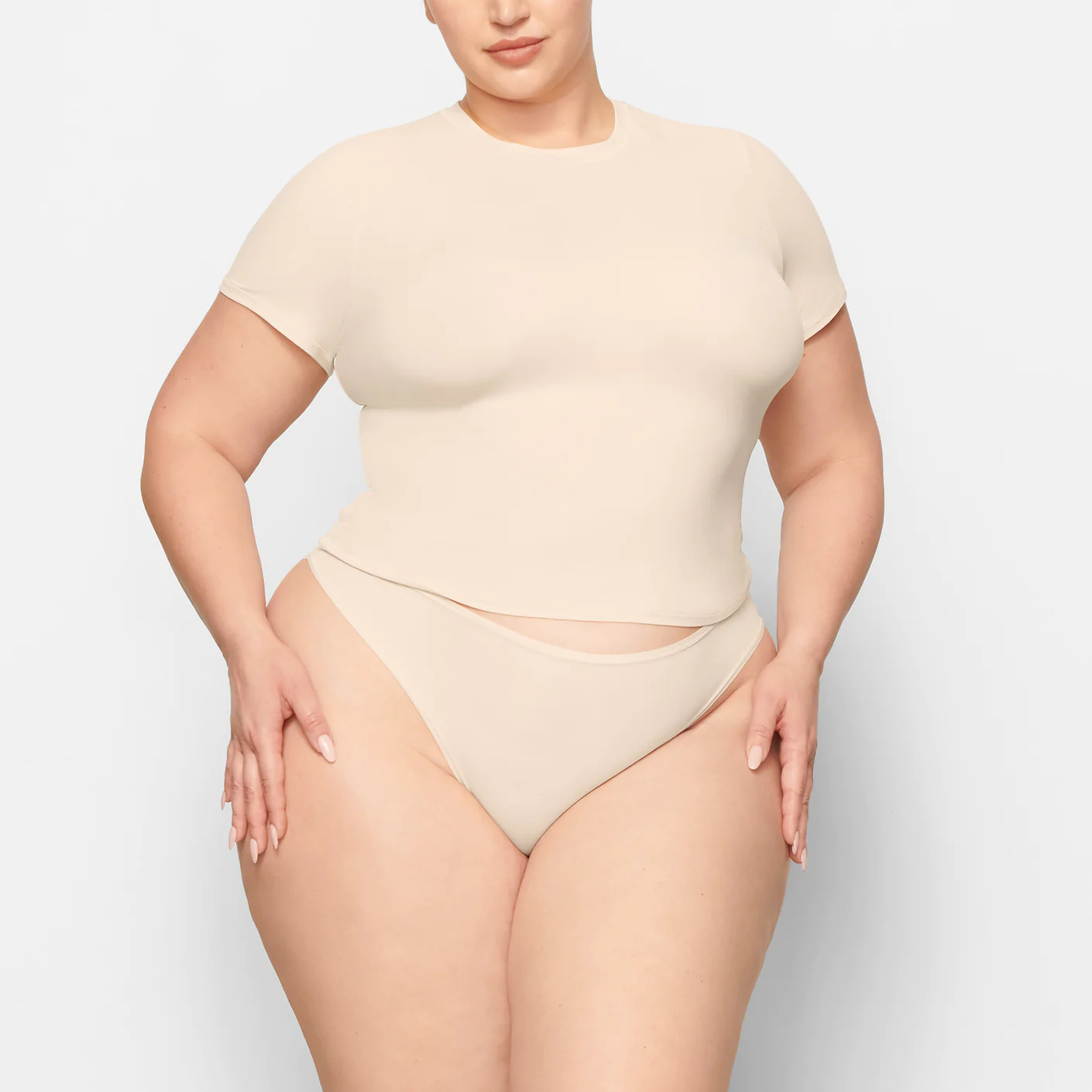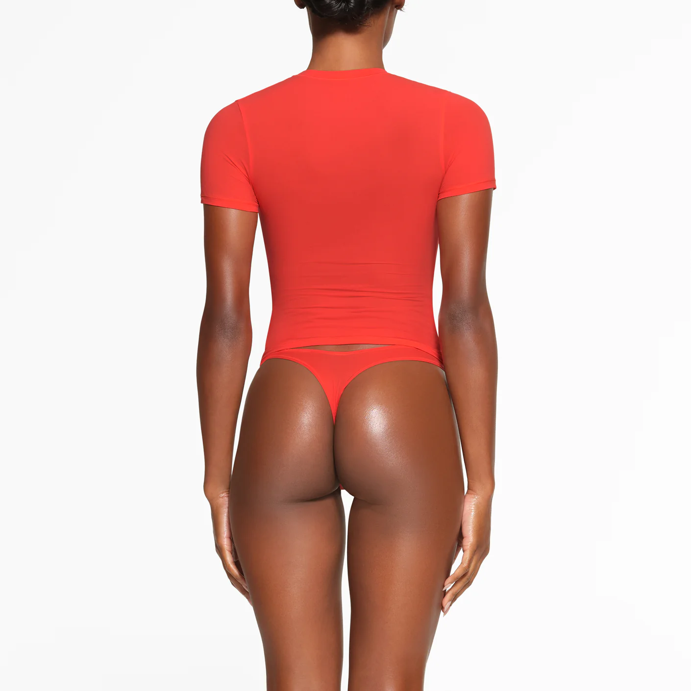 The essential everyday fitted t-shirt: with a crew neck fit and buttery soft feel, this body-hugging tee is perfect to wear alone or layered under other pieces.