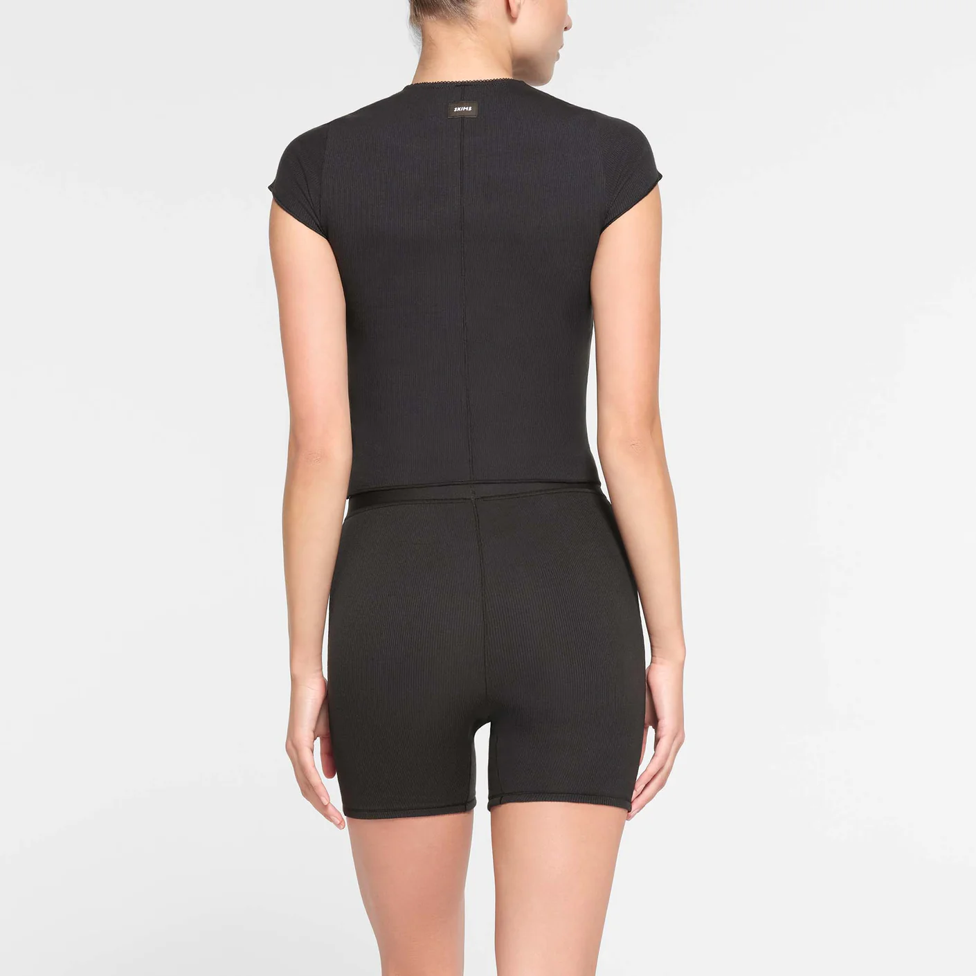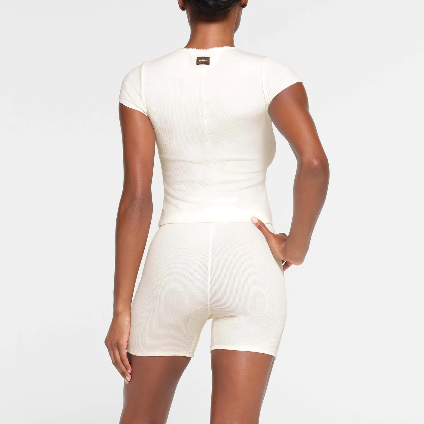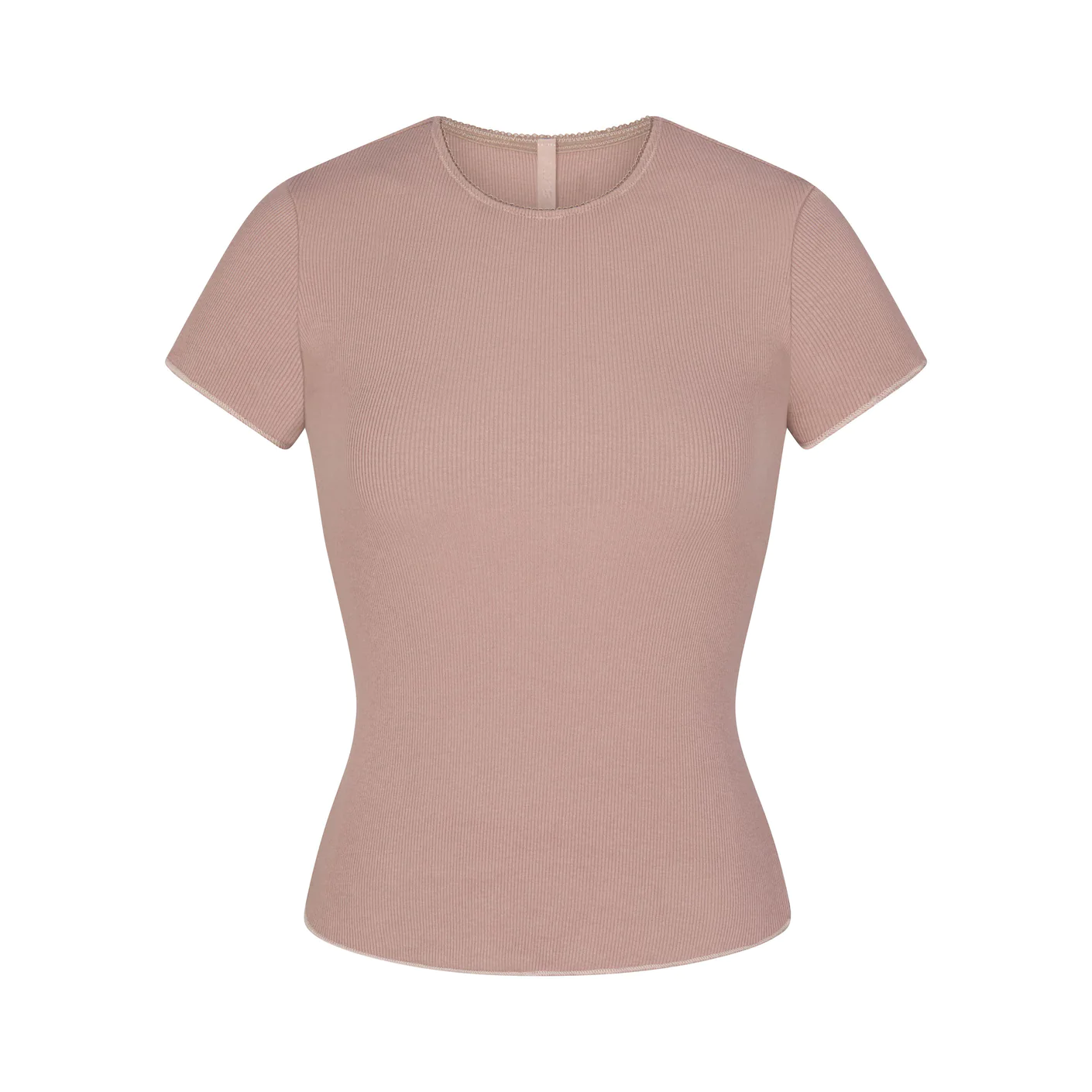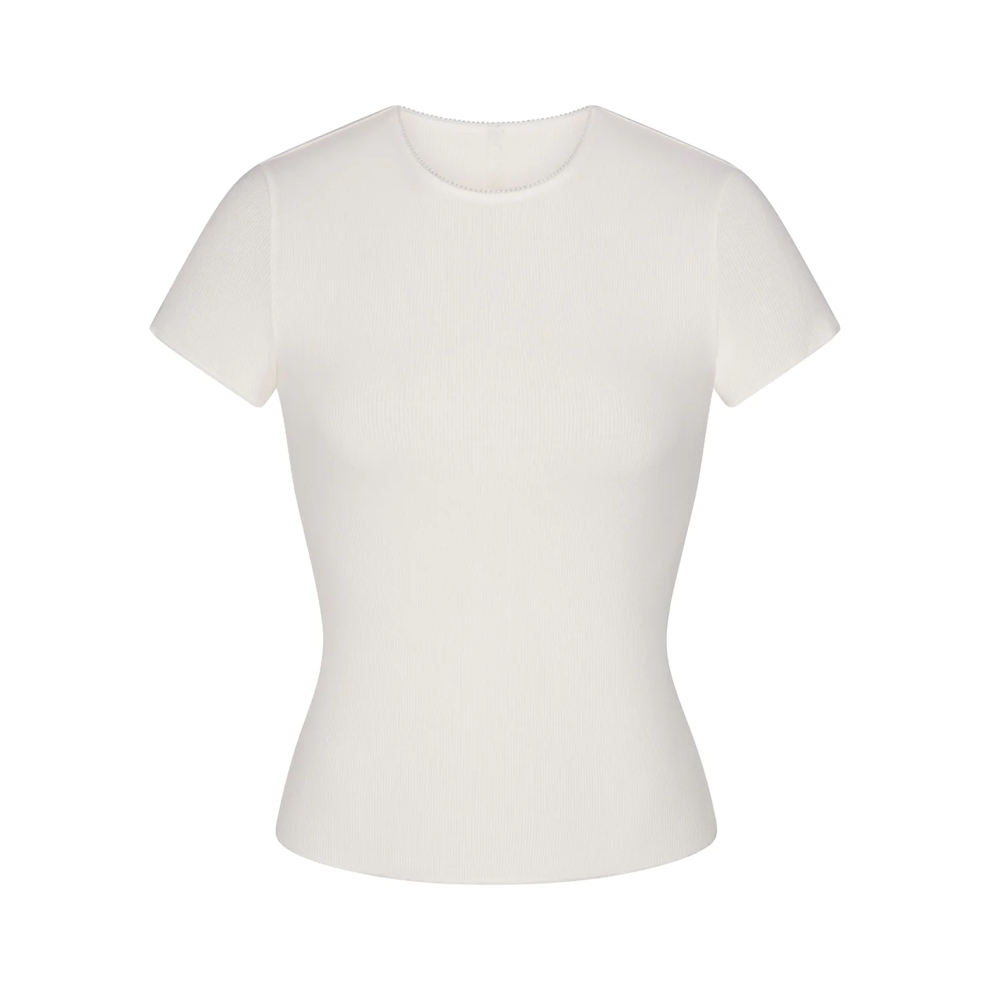 A classic tee with a feminine touch. This comfortably fitted top has dainty picot trim along the crew neck and features our best-selling ribbed cotton that flatters your curves. Hits below the natural waist and has a jacquard logo label in the back. Fits true to size.
