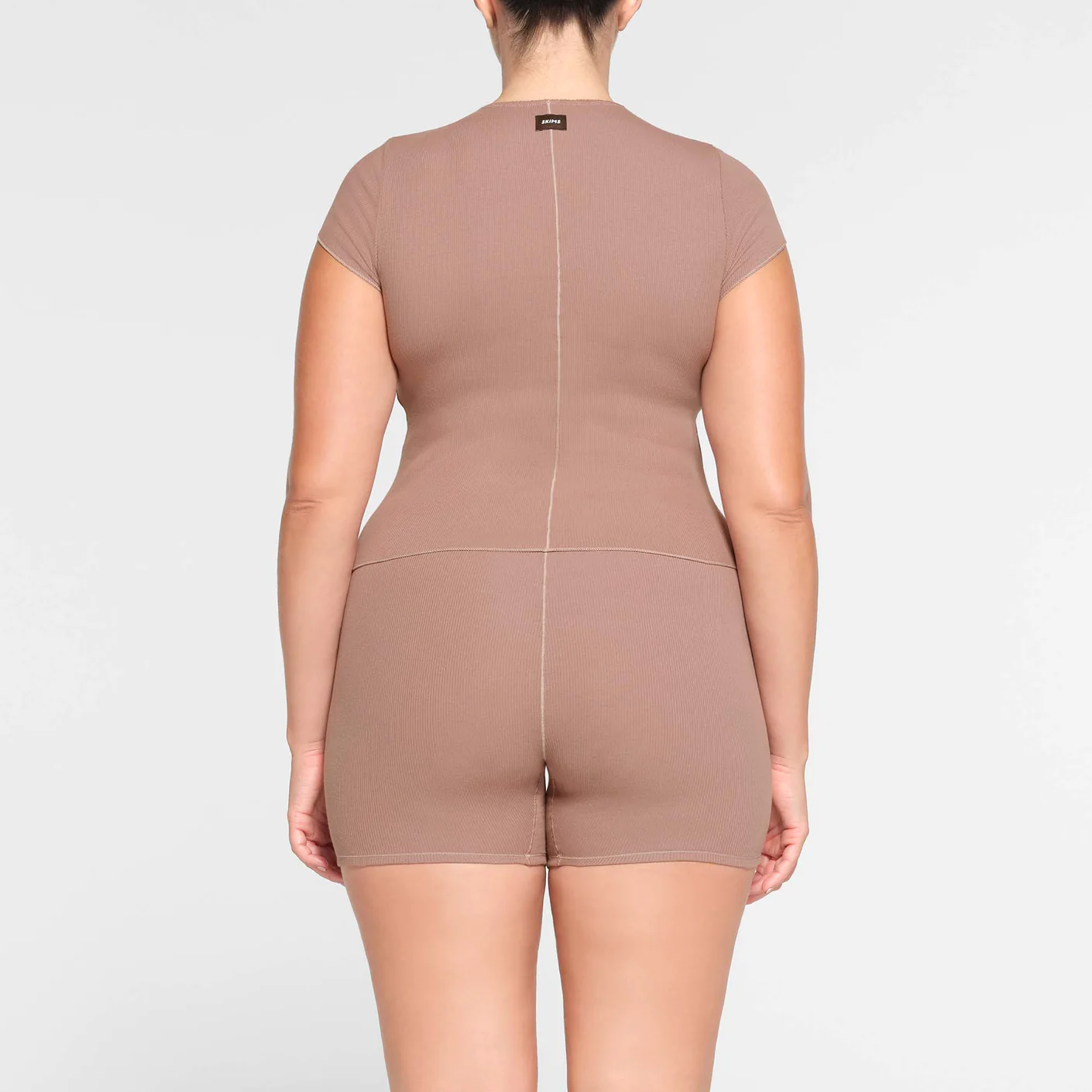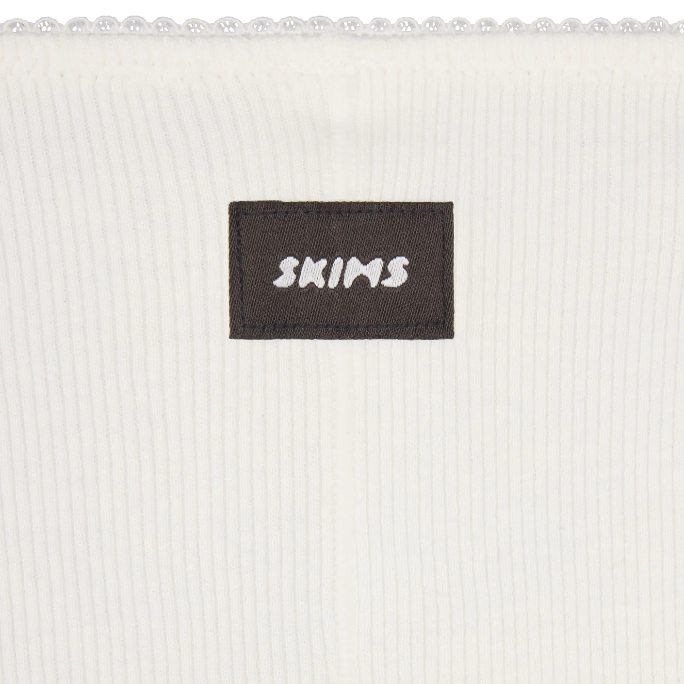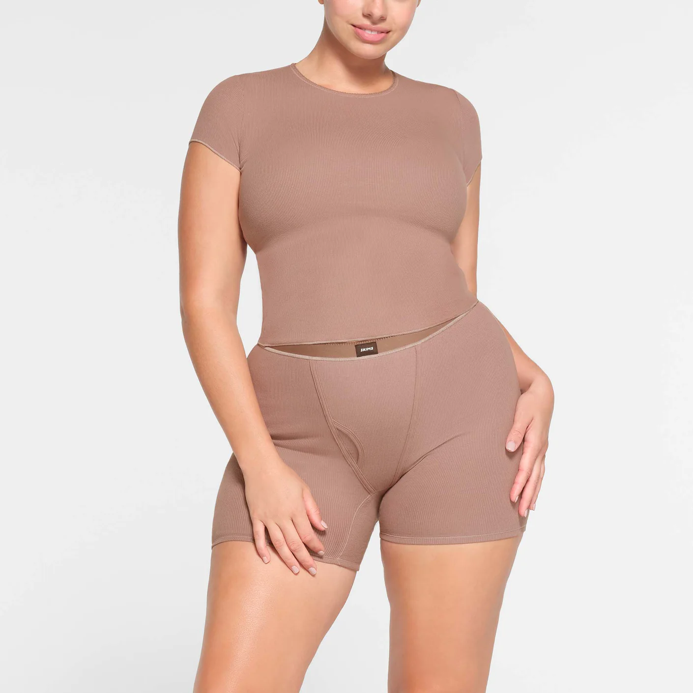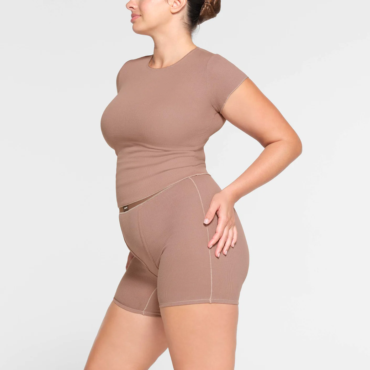 A classic tee with a feminine touch. This comfortably fitted top has dainty picot trim along the crew neck and features our best-selling ribbed cotton that flatters your curves. Hits below the natural waist and has a jacquard logo label in the back. Fits true to size.