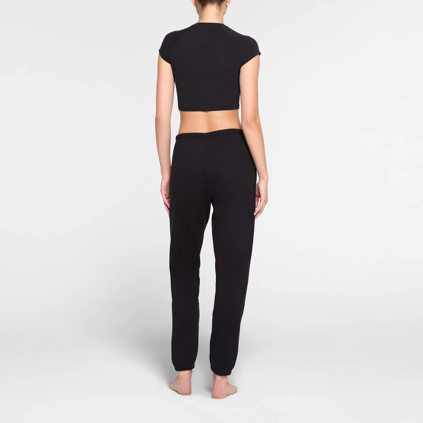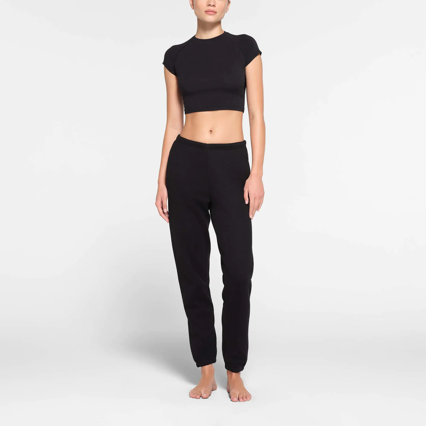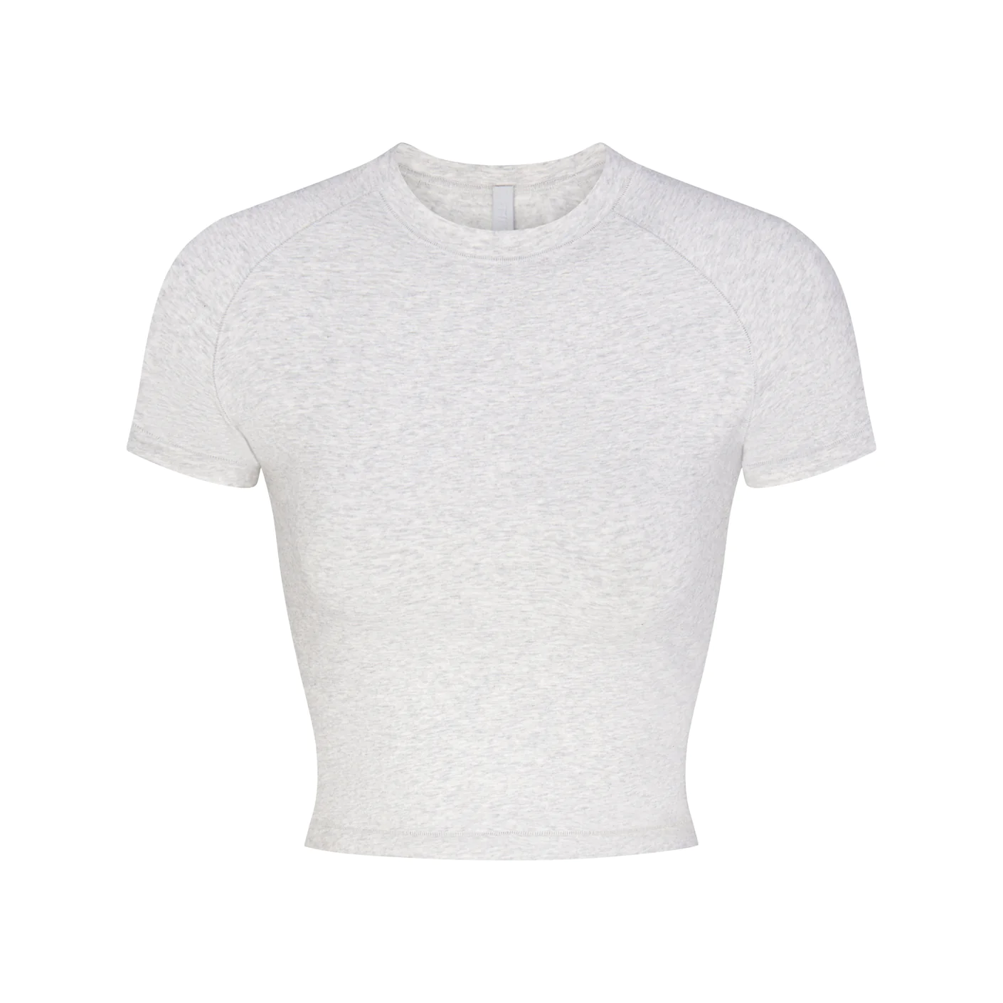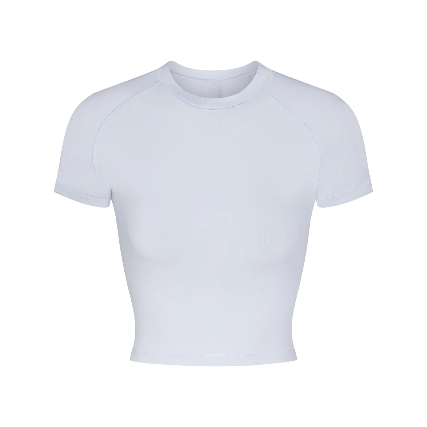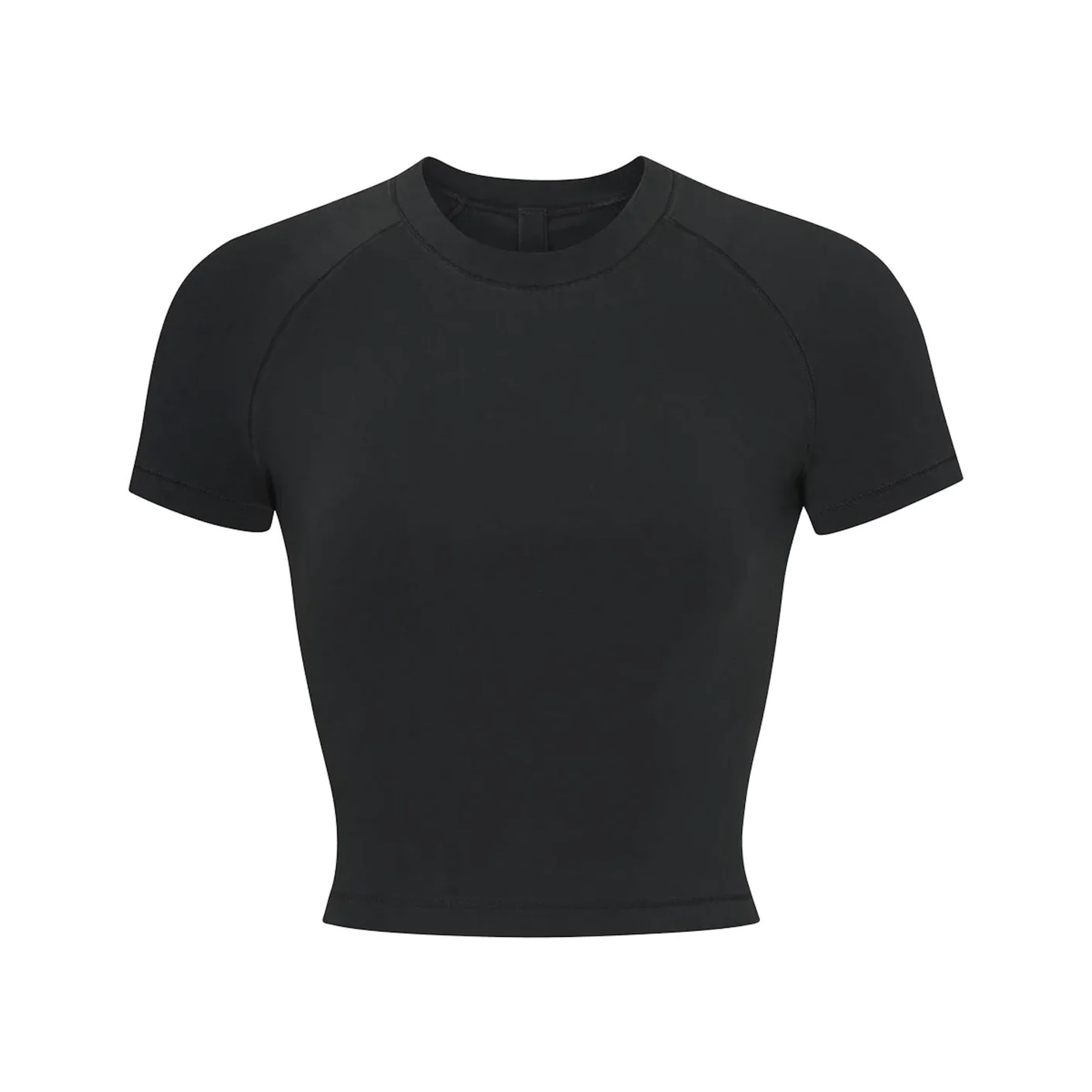 - casual raglan t-shirt, classic high crew neckline, fitted short raglan sleeves, hits at natural waist, body-hugging fit